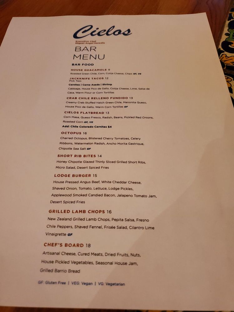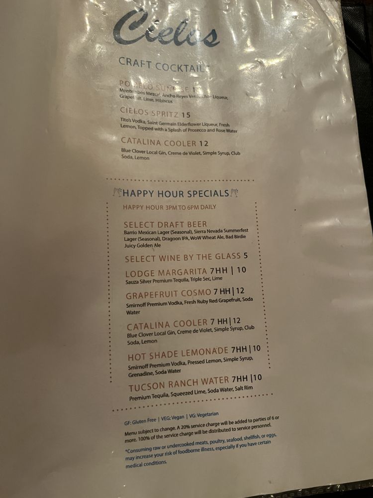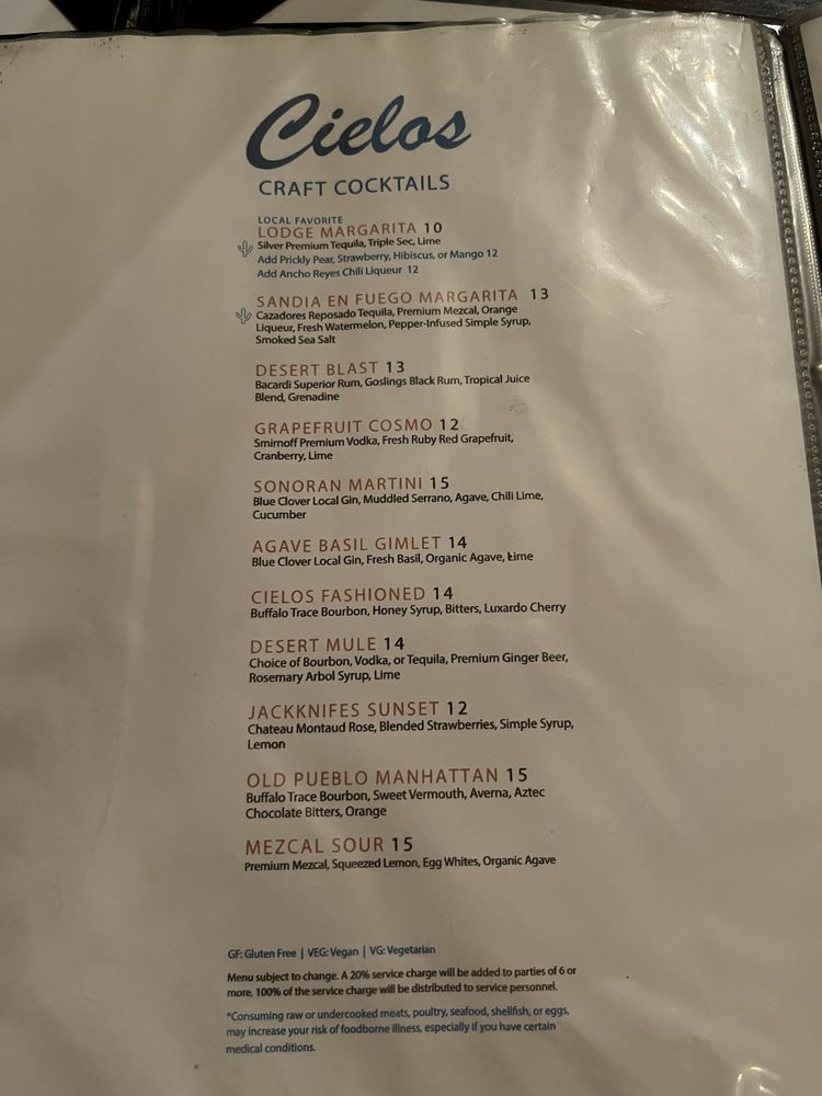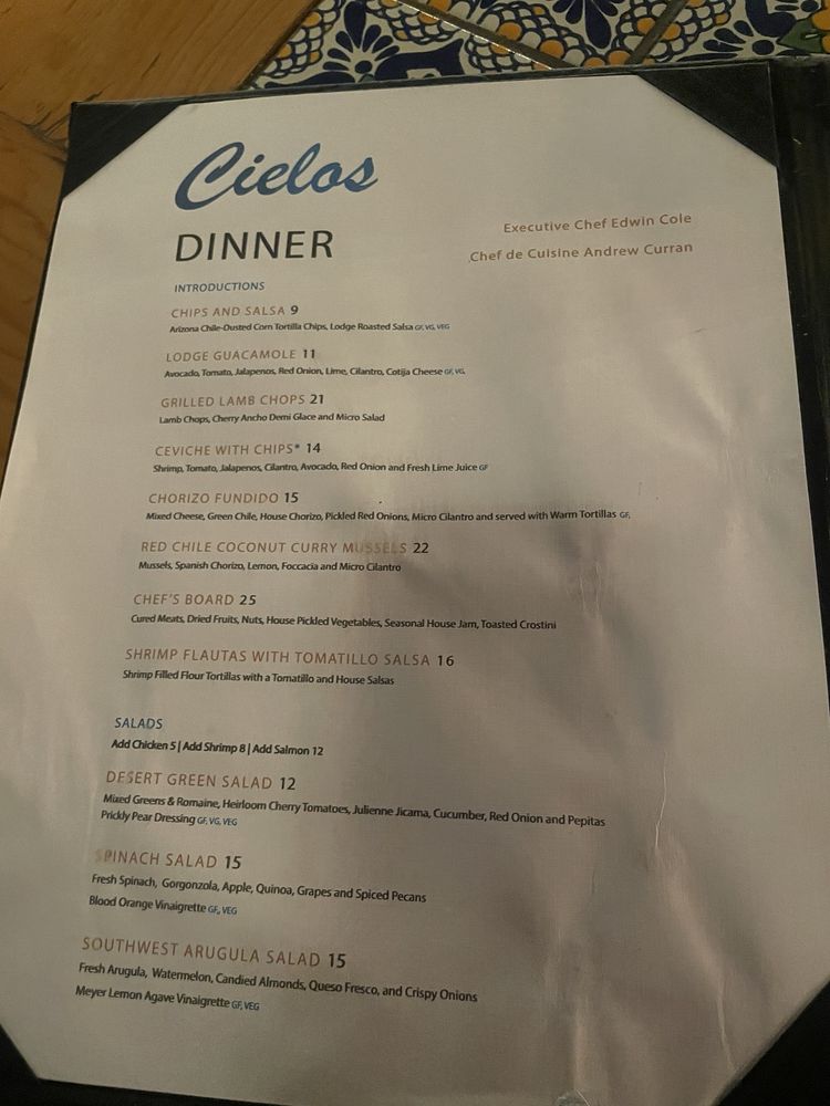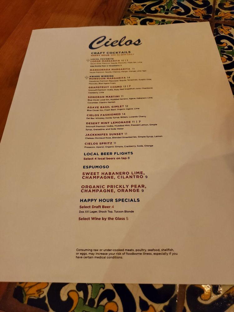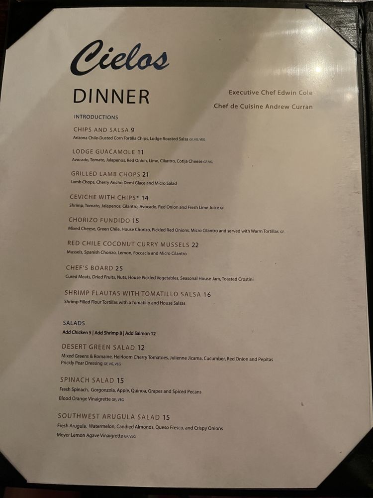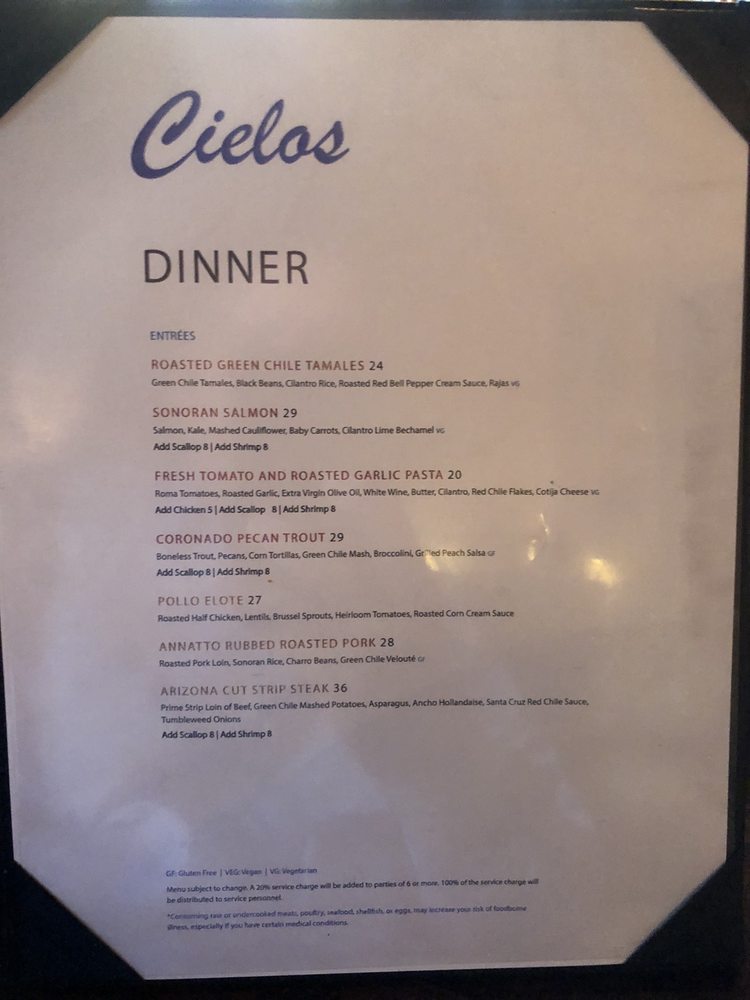 Introducing Cielos, a delightful cocktail bar and restaurant in Tucson, AZ. Offering a mix of New American cuisine, breakfast, and brunch options, Cielos provides a range of dining experiences. From their impeccable wine list to creative cocktails, this establishment is perfect for a romantic evening or a gathering with friends. The reviews rave about the outstanding service, flavorful dishes like green corn tamales and southwest salad, and decadent desserts like churros and pecan cheesecake. The ambiance is described as romantic, with live music and multiple fireplaces creating a cozy atmosphere. Prices may be on the higher side, but the quality and experience make it worth it. Cielos is a gem in Tucson, offering a memorable dining experience that is sure to impress.